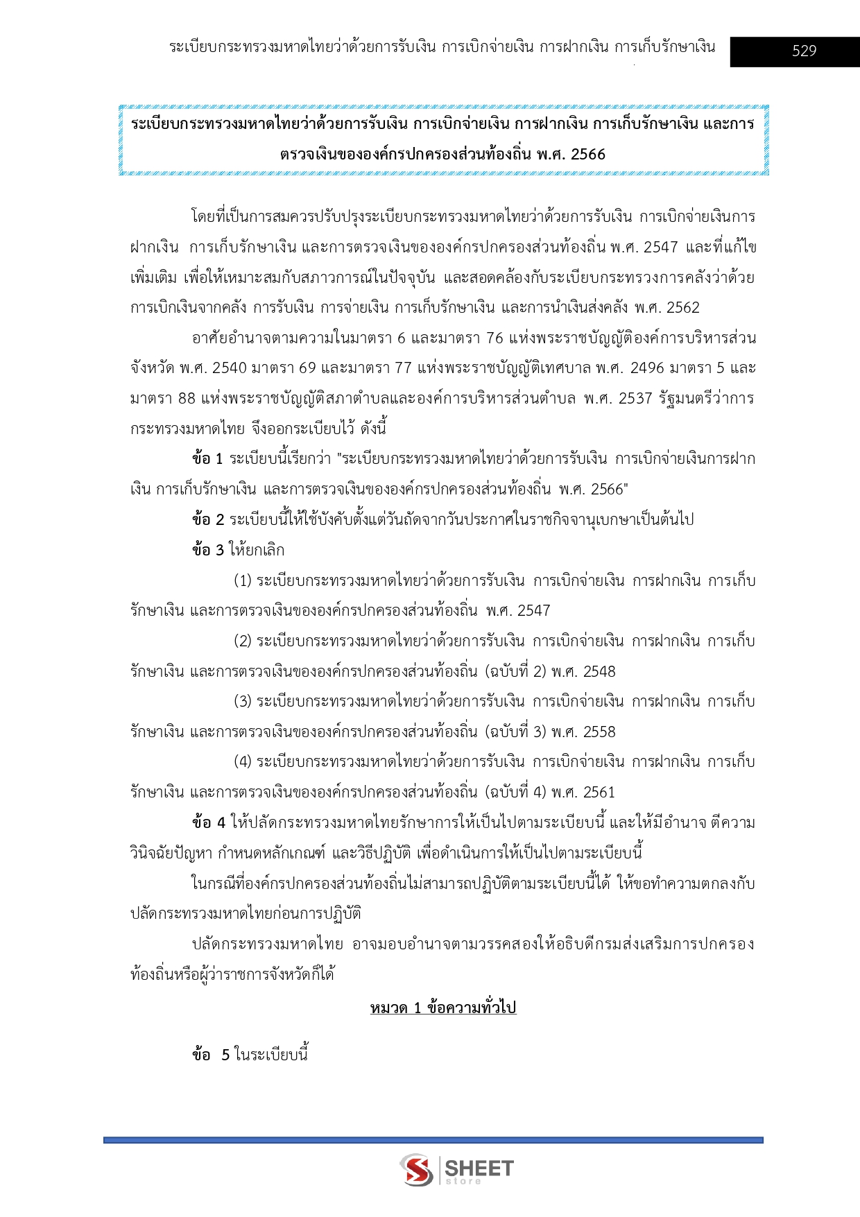 – ระเบียบกระทรวงมหาดไทยว่าด้วยการรับเงิน การเบิกจ่ายเงิน การฝากเงิน การเก็บรักษาเงิน และการตรวจเงินขององค์กรปกครองส่วนท้องถิ่น พ.ศ. 2566