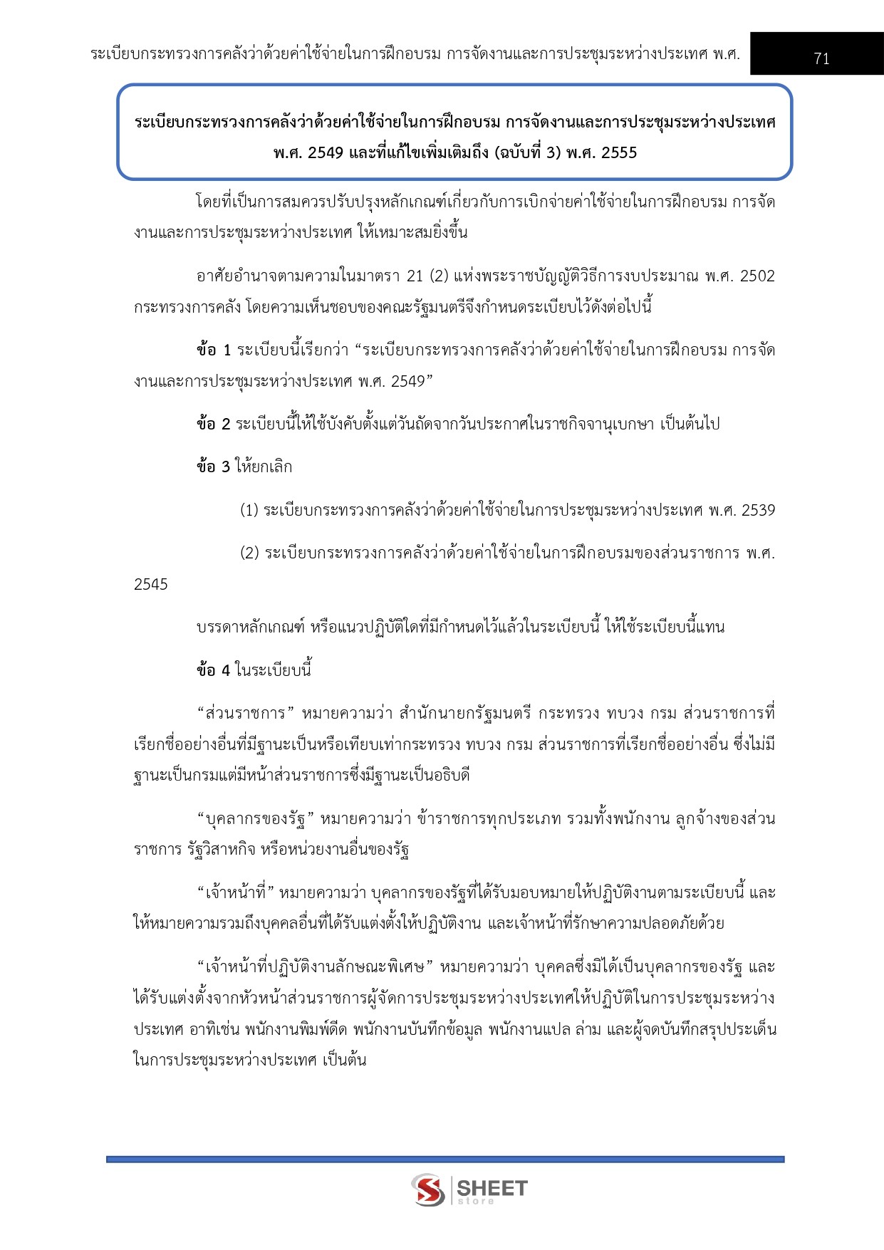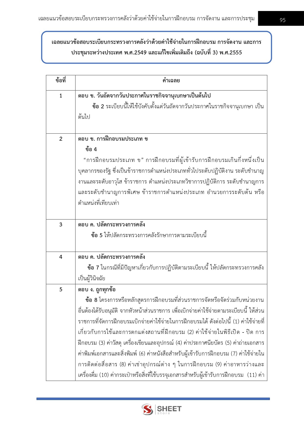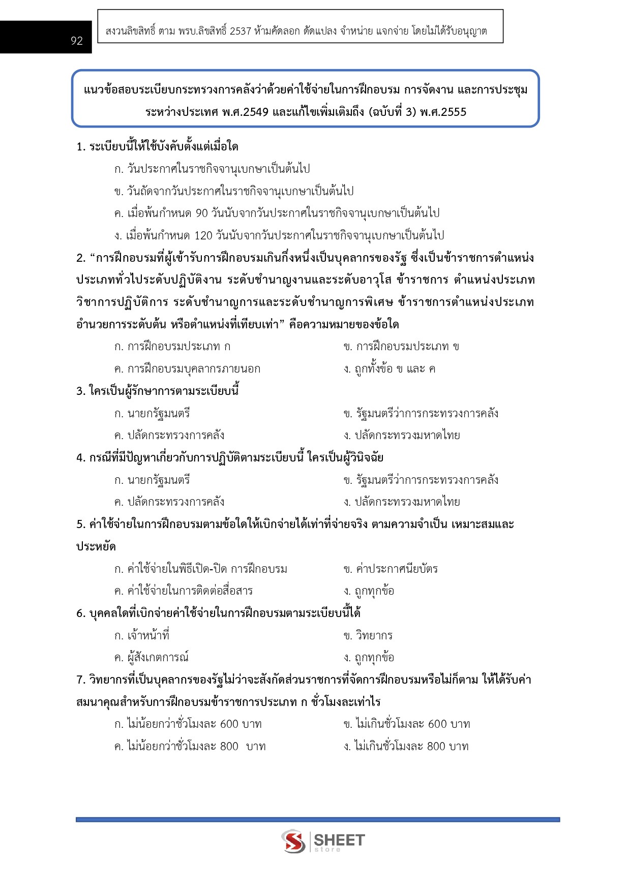 – แนวข้อสอบระเบียบกระทรวงการคลังว่าด้วยค่าใช้จ่ายในการฝึกอบรม การจัดงานและการประชุมระหว่างประเทศ พ.ศ. 2549 และที่แก้ไขเพิ่มเติมถึง (ฉบับที่ 3) พ.ศ. 2555