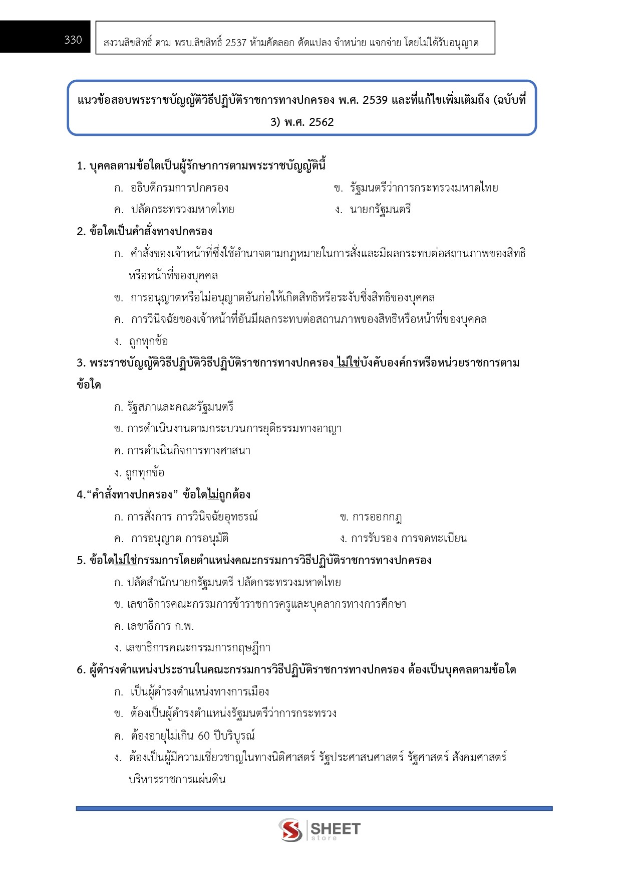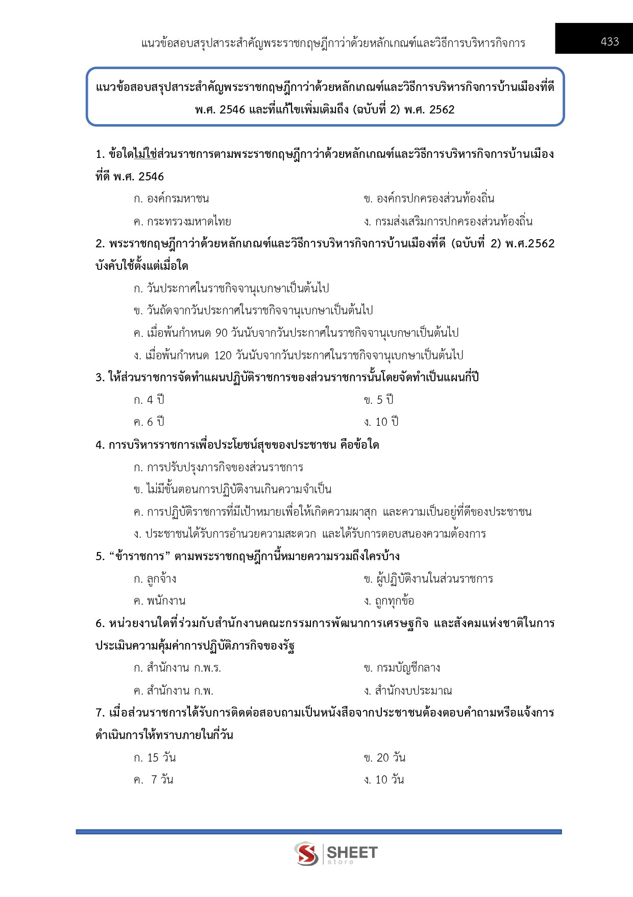 – แนวข้อสอบสรุปสาระสำคัญพระราชกฤษฎีกาว่าด้วยหลักเกณฑ์และวิธีการบริหารกิจการบ้านเมืองที่ดี พ.ศ. 2546 และที่แก้ไขเพิ่มเติมถึง (ฉบับที่ 2) พ.ศ. 2562