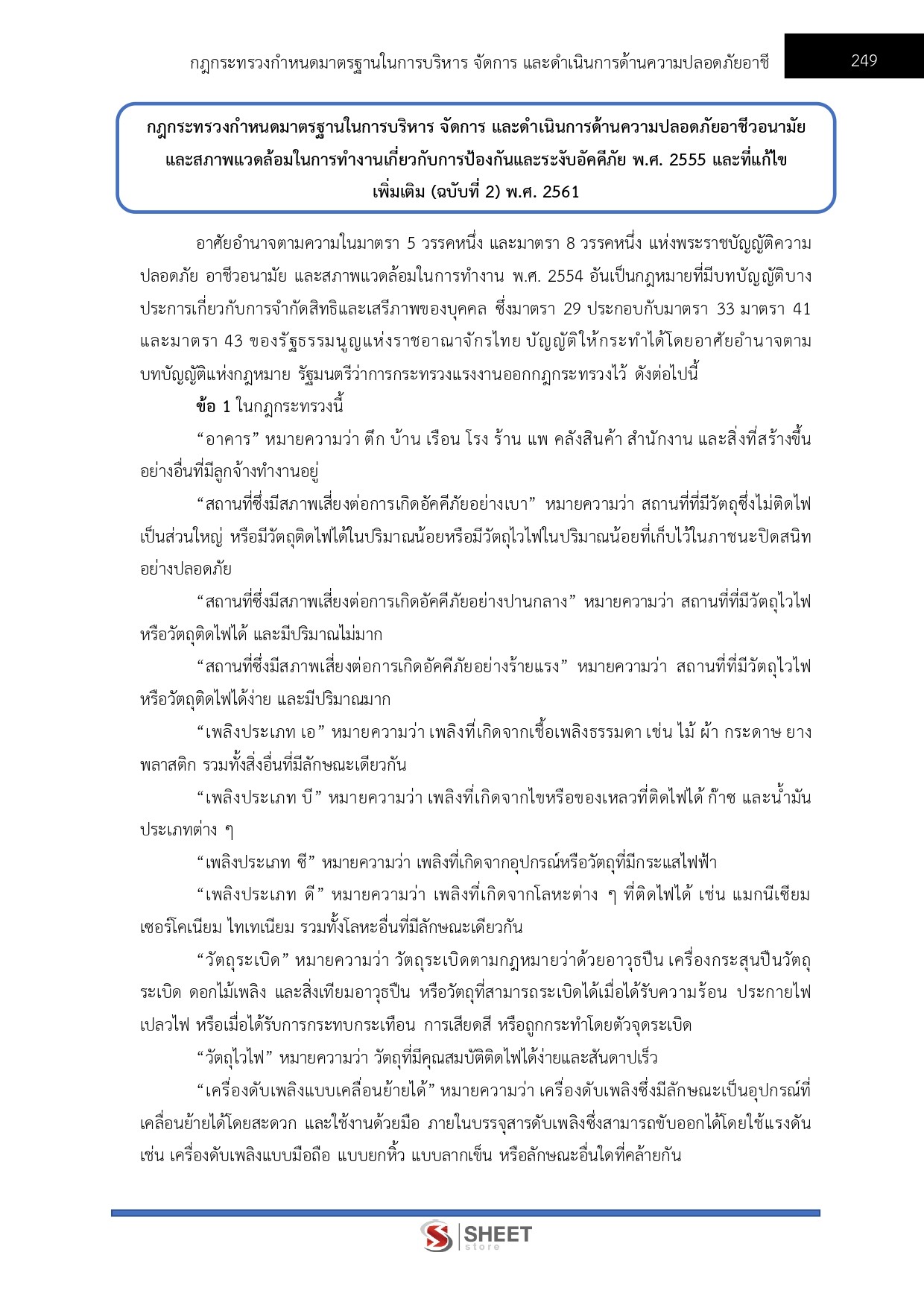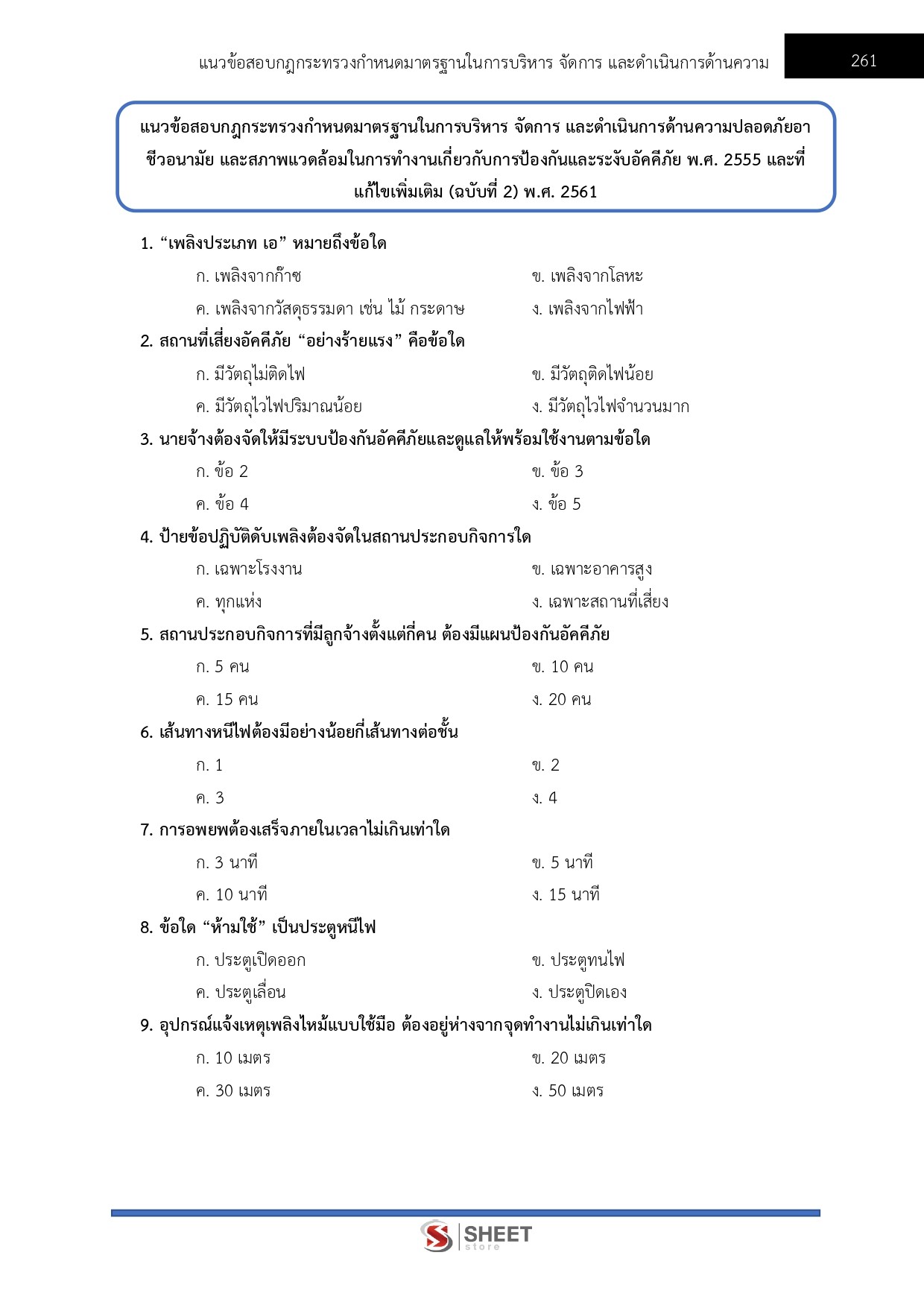 – แนวข้อสอบกฎกระทรวงกำหนดมาตรฐานในการบริหาร จัดการ และดำเนินการด้านความปลอดภัยอาชีวอนามัย และสภาพแวดล้อมในการทำงานเกี่ยวกับการป้องกันและระงับอัคคีภัย พ.ศ. 2555 และที่แก้ไขเพิ่มเติม (ฉบับที่ 2) พ.ศ. 2561