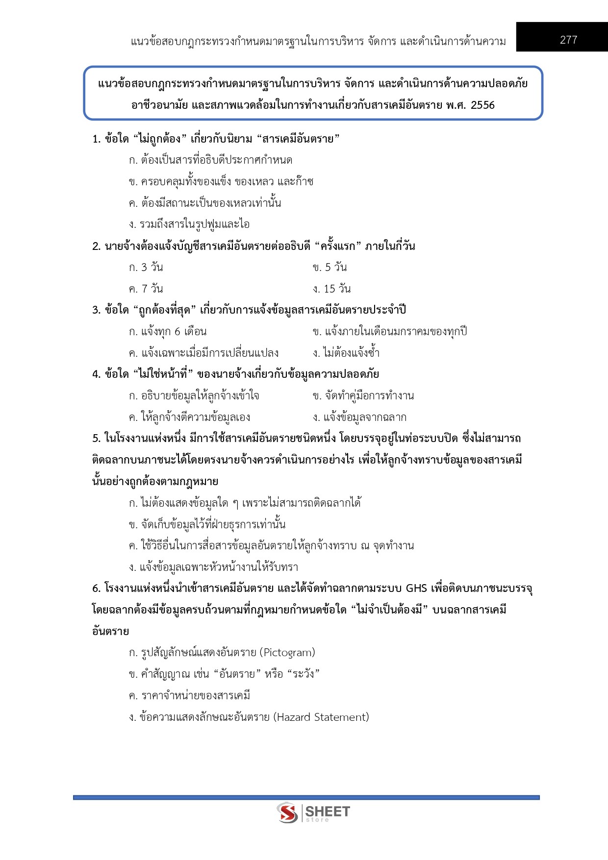 – แนวข้อสอบกฎกระทรวงกำหนดมาตรฐานในการบริหาร จัดการ และดำเนินการด้านความปลอดภัยอาชีวอนามัย และสภาพแวดล้อมในการทำงานเกี่ยวกับสารเคมีอันตราย พ.ศ. 2556